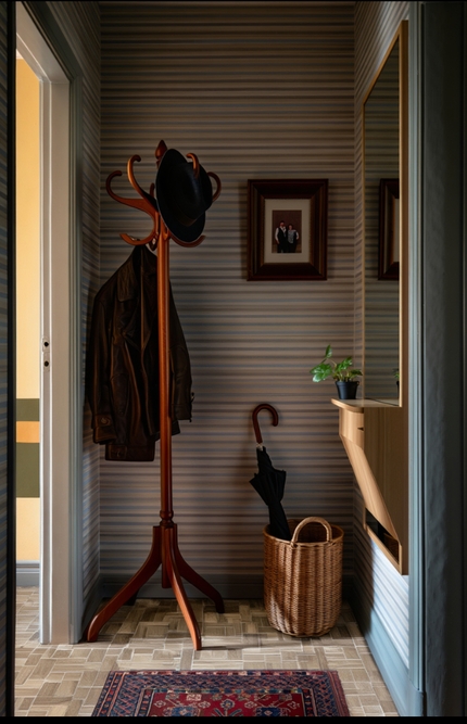 Пример: В коридоре 4 м² обои с тонкими полосами сделали его шире, а зеркало в конце добавило глубины.