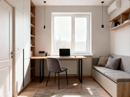 Пример: В студии 20 м² кровать-трансформер у стены днём становится частью шкафа, а вечером — полноценным спальным местом. Рядом — столик, раскладывающийся в письменный стол.