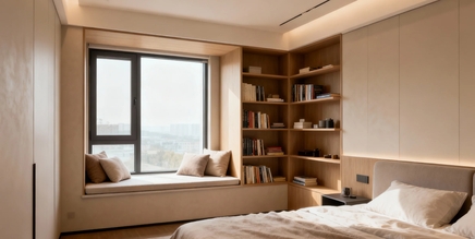 Пример: В спальне 10 м² широкий подоконник стал рабочим местом с подушкой и ящиком под ним для книг.