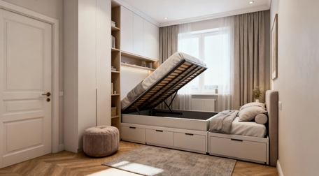 - Скрытые системы: Под кроватью, внутри пуфов или диванов с ящиками можно хранить постельное бельё, сезонную одежду или редко используемые вещи. Например, кровать с подъёмным механизмом — это десятки литров дополнительного пространства.